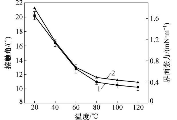对20,40,60,80,100和120℃温度下DBTL在CBT500光滑薄板上静态接触角进行测量,结果如图4所示。结合上述温度下DBTL界面张力1(如图3所示),将和1代入式(3),计算相应温度下DBTL与CBT500的接触角法界面张力12,结果如图4中界面张力所示。由图4可知:随着温度升高,接触角和接触角法界面张力具有相同的下降规律,不同温度区间内下降趋势不同,20~60℃温度区间下降趋势最大,60~80℃温度区间下降趋势次之,80~120℃温度区间下降趋势平缓。由Young方程可得cos=(2−12)/1,代入上述关系,即温度升高,接触角减小;除此外,不同温度区间内,DBTL对CBT500初期诱导率不同,从而导致不同温度区间内静态接触角、界面张力下降趋势不一致。