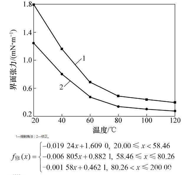 无污染、无反应条件下,温度对不同材料体系界面张力的影响呈线性关系。本文忽略混合时物质反应与杂质对界面张力的影响,以斜率变化为分界点,采用最小二乘法分段线性拟合修正后界面张力数据,获得20~120℃温度范围内修正后CBT500/DBTL界面张力与温度函数关系式。依据界面张力与温度斜率逐渐减小且趋于平缓和界面张力与温度呈线性关系,以第三段界面张力与温度关系式作为120~200℃温度范围内界面张力函数关系式,即20~200℃温度范围内,修正后CBT500/DBTL的界面张力与温度之间的分段函数关系式为1—接触角法;2—修正。
