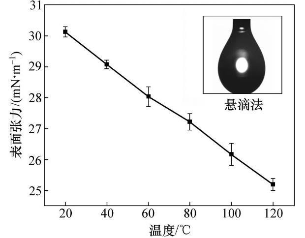采用瑞典Biolin Scientific Theta光学接触角测量仪的悬滴法测量20,40,60,80,100和120℃温度下DBTL的表面张力。将DBTL缓慢从自制滴管中滴出,当液滴外形出现轻微缩颈时,保温30 s,测量该状态下表面张力,每个温度点测5次求算术平均值作为该温度下表面张力。