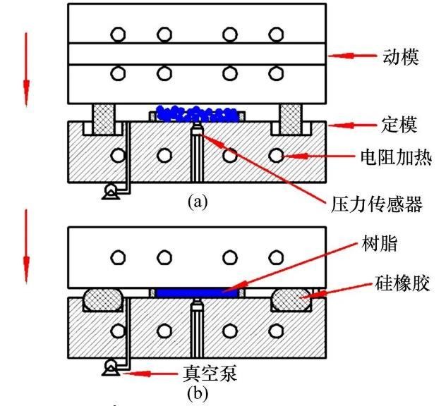 (a)动模下降至密封圈后抽真空;(b)施压与保压