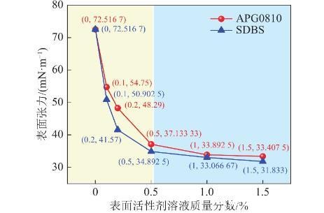 SDBS和APG0810表面活性剂溶液表面张力随质量分数变化如图4所示,随着表面活性剂溶液质量分数增加,表面张力逐渐降低,降低幅度逐渐减缓。