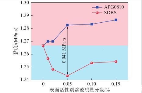 在质量分数为0.05%时两种表面活性剂溶液黏度相差0.041 MPa·s,达到最大值,这是由于在该质量分数下SDBS溶液未形成胶束,且离子之间斥力最大,而APG0810溶液开始形成胶束,溶液内分子间碰撞概率变大。