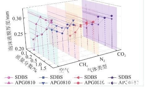 对比相同质量分数下不同气体注入时表面活性剂泡沫液膜厚度进行分析。注入空气情况下,溶液质量分数0.15%时,APG0810溶液在泡沫液膜最大,约为0.315 mm,注入甲烷泡沫液膜厚度比空气低0.006 mm,SDBS溶液泡沫液膜厚度为0.297 mm,注入甲烷泡沫液膜厚度比空气低0.004 mm,这是由于甲烷气体密度低于空气,扩散速率比空气快。APG0810和SDBS溶液在二氧化碳注入时比空气分别低0.002 mm和0.004 mm。这是由于二氧化碳气体为酸性气体,离子型表面活性剂溶液在酸性环境不易形成泡沫液膜结构,非离子表面活性剂溶液则不易受酸碱度干扰。