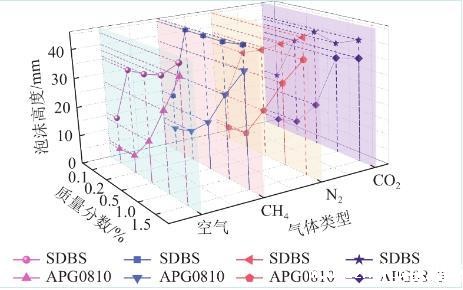 对比同一种溶液通入不同气体的高度进行分析,空气、氮气及二氧化碳注入液体发泡性规律基本一致,均在质量分数最高时发泡率达到最大。通入甲烷时则在SDBS溶液质量分数为0.02%时就达到了与0.15%接近的发泡高度。APG0810在甲烷注入时也比其他气体总体发泡率高,这是由于甲烷的摩尔质量最低,气体密度低,分子扩散快,泡沫膨胀速率变快导致的。