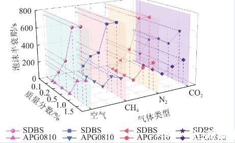 空气、甲烷及氮气的稳泡性规律大致相同,注入空气情况下,SDBS溶液质量分数为0.15%时泡沫半衰期约为786.5 s,二氧化碳注入液体的稳泡性明显下降,质量分数为0.15%时为584 s,比空气低202.5 s。推测这是由于二氧化碳为酸性气体,表面活性溶液在酸性环境下泡沫稳定性不足,泡沫液膜强度不易控制酸性气体造成的。而APG0810表面活性剂溶液泡沫半衰期在四种气体注入情况下差异不明显,是由于APG0810为非离子表面活性剂,在溶液中不是以离子状态存在,由此可以推出它的稳定性高,不易受强电解质影响,也不易受酸、碱影响。