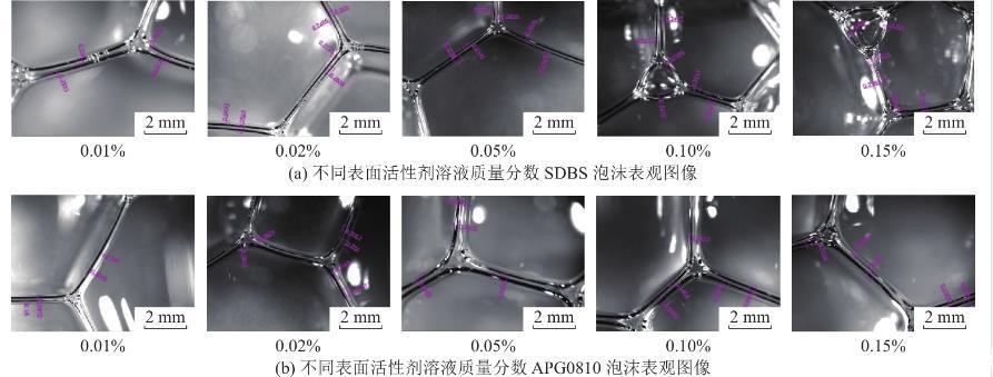 根据以上试验结果可以获得,溶液表面张力越小,则溶液发泡性能越好,溶液表面张力与发泡特性有较明显相关性,而溶液黏度与泡沫性质相关性不显著。APG0810溶液黏度随质量分数增加而增加,发泡性及泡沫稳定性也逐渐增加,而SDBS溶液黏度先随着溶液质量分数增加而降低,浓度较大时有上升趋势,溶液发泡性及泡沫稳定性呈现逐渐增加趋势,且发泡性与泡沫稳定性均优于APG0810溶液。