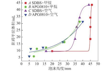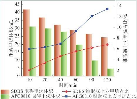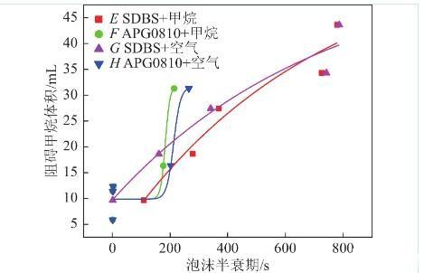 4)泡沫稳定性是决定甲烷缓释效应的关键因素,泡沫稳定性越强,越能有效控制甲烷流动。可直接采取空气-表面活性剂泡沫的各项参数表示泡沫性质。阴离子表面活性剂SDBS表现较好,泡沫稳定性较强,随着时间推移,SDBS也有比APG0810更好控制甲烷释放的效果。质量分数为0.15%时,10 min内SDBS可以控制约占总通入甲烷体积87%的甲烷。120 min后仍可控制约占通入总体积49.16%的甲烷。