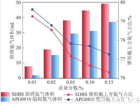 表面活性剂泡沫对氮气缓释作用结果如图11所示。相同质量分数下,SDBS溶液对氮气的缓释效应优于APG0810,质量分数为0.15%时,SDBS和APG0810溶液泡沫阻碍氮气体积分别为49.102 mL和37.042 mL。