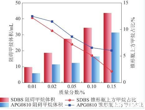 通过式(4)计算得到泡沫中注入气体含量。图10中柱状图可以看出,SDBS溶液泡沫对甲烷的束缚效果明显优于APG0810,APG0810溶液由于发泡性及泡沫稳定性均弱于SDBS,故对甲烷束缚能力较差。质量分数为0.05%的SDBS可控制27.43 mL甲烷,0.15%的SDBS可控制43.649 mL甲烷,占总注入甲烷体积87%。质量分数为0.15%的APG0810溶液可控制31.33 mL甲烷,占总注入甲烷体积62.6%。