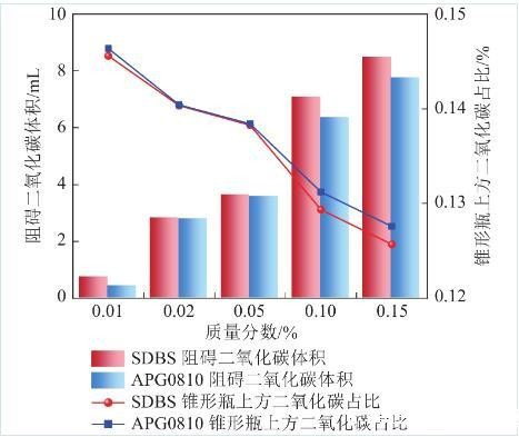 图12为注入二氧化碳的气相色谱检测结果,计算出表面活性剂泡沫对二氧化碳的缓释作用结果如图12柱状图所示。相同质量分数下,SDBS溶液对二氧化碳的缓释效应优于APG0810。然而两种表面活性剂对二氧化碳缓释效应均不显著,SDBS表面活性剂溶液在质量分数最大时10 min内只控制了8.46 mL二氧化碳气体,APG0810只控制了7.74 mL二氧化碳气体。