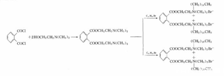 邻苯二甲酰氯与过量的N,N-二甲基乙醇胺反应生成二(二甲基胺基乙基)邻苯二甲酸酯(Ⅰ),二邻苯二甲酸酯(Ⅰ)再分别与正溴代十四烷和正溴代十六烷反应,得到双季铵基邻苯二甲酸酯Gemini表面活性剂。反应式见图1。