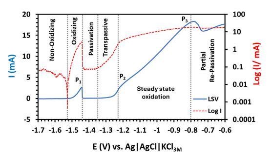 图1电化学线性扫描伏安图(LSV,蓝色实线)及液滴电流的对数图(红色虚线),针对1 M NaOH中的镓铟合金,扫描速率为0.5 mV/s。垂直虚线将图中标记的六个反应区域区分开来,标记出三个氧化峰P1、P2和P3。