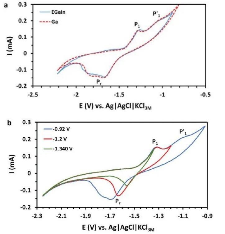 初始氧化区域:在略高于开路电位时,镓开始发生氧化反应,但生成的氧化物不在表面堆积,而是持续溶解,因此表面张力没有明显降低。钝化薄膜形成:随着电位继续升高,镓表面逐渐形成一层薄的氧化膜,电流开始下降,表面逐渐进入钝化状态,推测该薄膜为镓氧化物的水合物薄层。