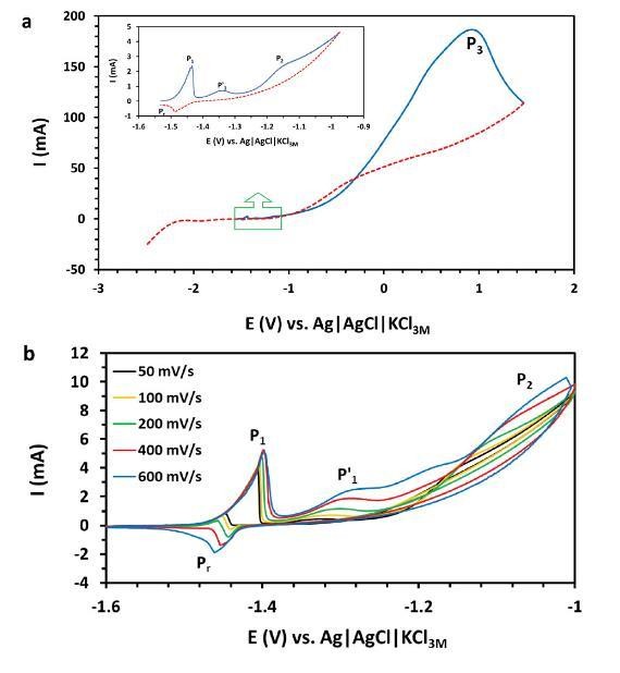 图2(a)在300 mV/s扫描速率下,镓铟合金液滴在1 M NaOH中的循环伏安图。(b)不同扫描速率(50至600 mV/s)下的镓铟合金液滴循环伏安图。