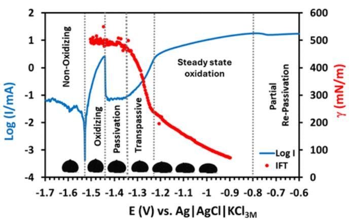 再钝化阶段:在更高电位下,表面部分重新钝化,表面张力略有回升,液滴变形的趋势得到一定抑制,推测是表面形成了新的氧化层薄膜。