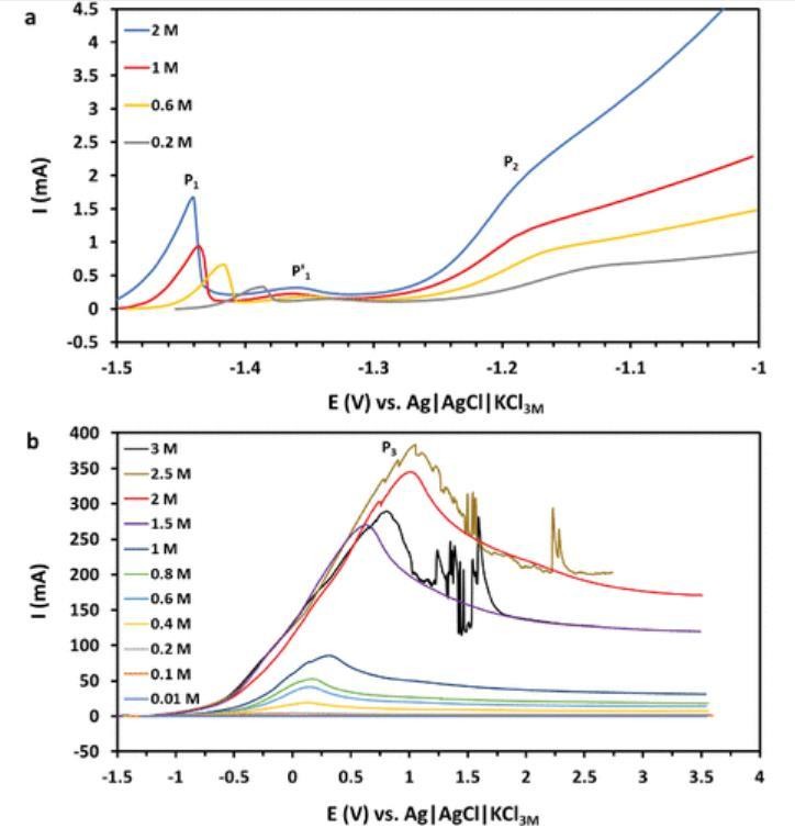 图4(a)镓铟合金在不同浓度NaOH中的近钝化区伏安图。(b)镓铟合金在不同浓度NaOH中的完整线性扫描伏安图,扫描速率为100 mV/s。