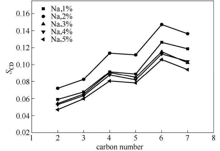 下面同样通过疏水链碳原子序参数的变化来进一步验证OPES的抗盐性。从图8中可以看出,在同一体系中随着碳原子的增加序参数值增大,这说明越接近疏水尾链的末端的碳原子有序性越好。同时,对于NaCl浓度为1%、3%、4%、5%的体系,疏水尾链碳原子的序参数并未发生太大改变,NaCl浓度为2%时其序参数值还要大于1%时的序参数值,这说明在浓度为2%的NaCl溶液中疏水链碳原子间的相互作用力最强。