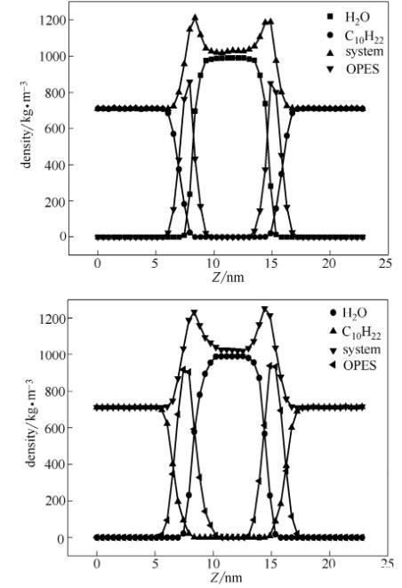 对于表面活性剂来说降低界面张力的能力是考察其性能好坏的重要指标之一,下面通过考察不同体系的界面张力和界面宽度来进一步说明OPES的界面性能,如表1所示。对于界面张力可以利用式(2)来计算,其中LZ为盒子高度;Pxx、Pyy、Pzz分别为x、y、z方向的压力。