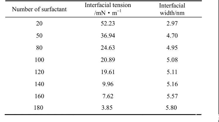 从表1可以发现表面活性剂数量的增加使得界面张力逐渐下降。其中当OPES数量由20增加到80时,界面张力值较高,这说明当表面活性剂浓度较低时并不能起到很好的降低界面张力的作用;随着表面活性剂数量进一步增加界面张力逐渐下降,当OPES数量为180时,达到临界饱和状态,此时界面张力仅为3.85 mN·m-1,此变化规律与真实实验规律相同。这同时也说明辛基酚聚氧乙烯醚磺酸盐可以很好地降低界面张力,是一种性能优良的表面活性剂。界面宽度用体系密度图中表面活性剂的密度曲线宽度来表示。随着表面活性剂个数增加界面宽度递增,起初界面宽度增加速度较快是因为界面OPES浓度过低并未饱和;当OPES数量达到100~140时,界面宽度仅有少量缓慢增加这是由于此时界面正在逐渐接近饱和状态。随着OPES的数量达到160和180时,界面宽度增加幅度变大,进一步验证此时界面已达到饱和状态。