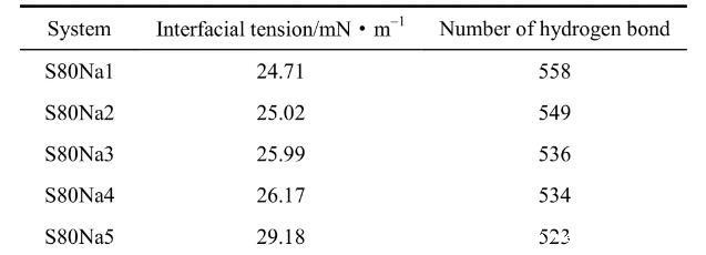 为进一步确定OPES的耐盐性能,可以再通过不同体系平衡状态时相应的界面张力和氢键数量来讨论,相关数据如表3所示。