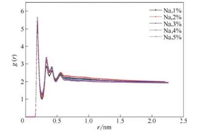 图7在不同Na+浓度体系中磺酸基中的氧原子与水中氢原子的径向分布函数