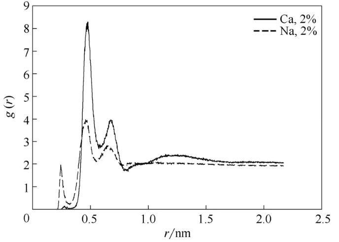 进一步分析OPES对Na+、Ca2+抗盐性的差别,考察了磺酸基中的氧原子与Na+、Ca2+的径向分布函数,如图11所示。图中两曲线的峰值出现较大差距,其中Na+曲线的峰值明显小于Ca2+曲线的峰值,这表明亲水基团与Na+的作用较小,也就是说Na+对OPES的性质影响较小。因此,辛基酚聚氧乙烯醚磺酸盐的抗盐性顺序为Na+>Ca2+,与对序参数所做的分析结论相同。