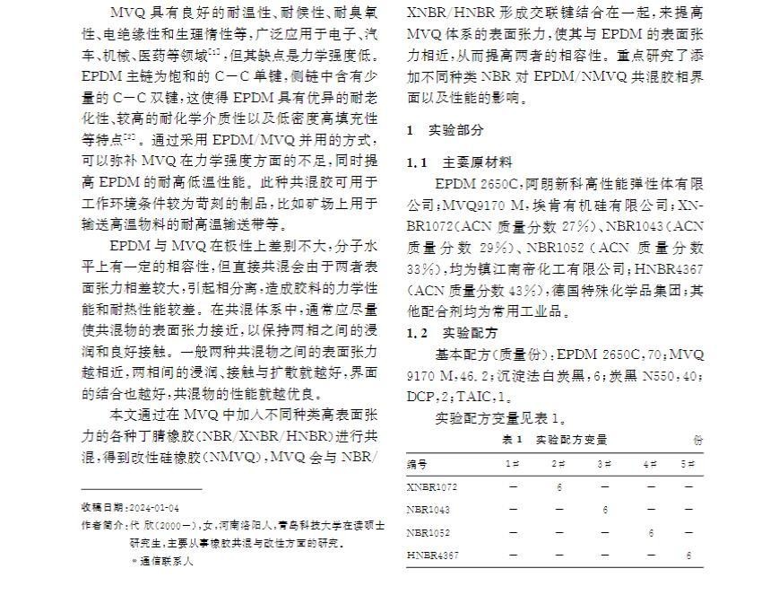 本文通过在MVQ中加入不同种类高表面张力的各种丁腈橡胶(NBR/XNBR/HNBR)进行共混,得到改性硅橡胶(NMVQ),MVQ会与NBR/XNBR/HNBR形成交联键结合在一起,来提高MVQ体系的表面张力,使其与EPDM的表面张力相近,从而提高两者的相容性。重点研究了添加不同种类NBR对EPDM/NMVQ共混胶相界面以及性能的影响。