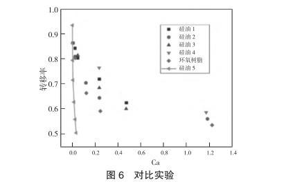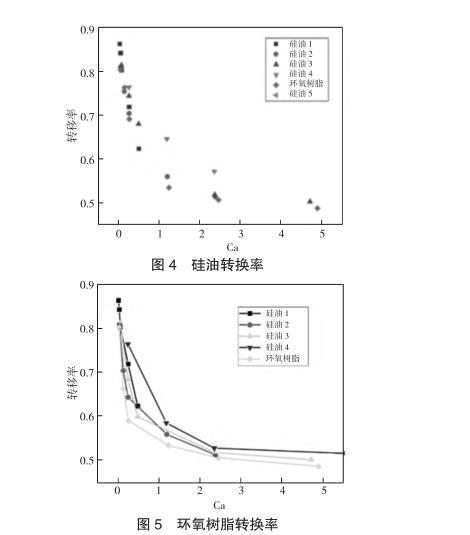 对不同黏度以及拉伸速度下的胶液进行测量并计算转移率,如图4所示,在忽略惯性力的条件下,采用无量纲数Ca来表示转移率,对于表面张力相似且不同黏度的四种甲基硅油的转移率有着相似的收敛情况。为了进一步印证Ca对转换率的影响,引入与甲基硅油不同表面张力的环氧树脂进行对比实验,如图5所示,表面张力较大的环氧树脂的转换率会比甲基硅油小,但整体趋势相差不大,均会收敛到一定数值。之后,为了了解惯性力对转移率的影响,选择黏度较小的胶液进行实验,同时加大移液针直径使其脱离微量点胶的范围,以提高惯性力对胶液传递的影响,如图6所示,在通过增加胶液体积以提高惯性力影响的实验中,胶液转移率的变化与之前有极大差异。