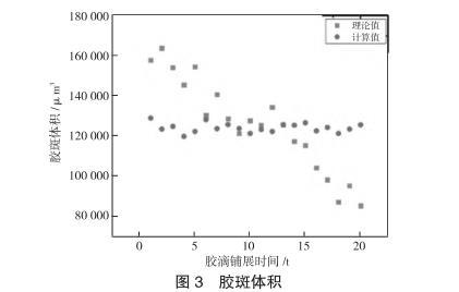 在液桥断裂后,转移到点胶面上的胶液在自身表面张力的作用下形成圆润的胶斑,在理想状态下胶斑可视为球冠状,其体积可用球冠状公式求得。实验主要使用的胶液为甲基硅油,其表面张力只有21 mN/m,低于环氧树脂,在基板上由甲基硅油形成的胶斑在稳定状态下与环氧树脂的形状不同,因此不能将其视为球冠状,需要其他计算体积的方法。为了提高计算的准确性通过灰度处理、二值化等图像处理的方法提取胶斑的轮廓信息,之后通过提取到的坐标信息来拟合胶斑轮廓的函数,使用旋转积分的方法来计算胶斑的体积。之后为了验证计算的准确性,在其他物性条件相同时,将5 000 cps的甲基硅油、3 mm/s的移液针抬升速度的实验条件下胶斑的铺展过程作为研究对象。用显微镜录制在液桥断裂后胶斑的铺展情况,以0.016 s为间隔,截取20张胶斑的图片分别用公式和积分法进行胶斑体积的计算,结果如图3所示。