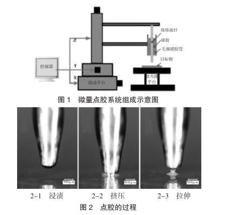 本课题组研制了一种基于移液针转印原理的微量点胶系统,该点胶系统所形成的胶斑直径可达到数十微米,胶滴体积可达飞升-皮升的范围。该系统的结构如图1所示。该系统由出胶单元、驱动单元和控制单元组成。其中,出胶单元为系统的核心,其主要包含微移液针和毛细储胶管两个关键元件,移液针通过在储胶管内的上下往复运动,实现胶液向基板的微量转移。驱动单元由X/Y/Z三个方向的驱动电机和微升降平台组成,用于驱动微移液针及点胶工件的运动。控制单元由PLC控制系统和LaBview开发的控制面板组成,实现对电机运动的自动控制。