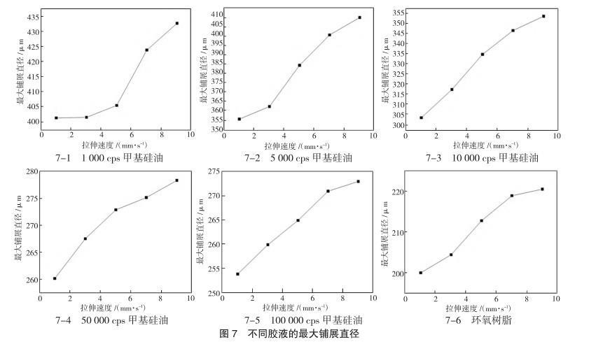 点胶结果最直观的显示就是形成胶斑达到稳定状态时胶斑的直径,因此对胶斑的直径进行研究。选取5种表面张力相似黏度不同的甲基硅油以及黏度为10 000 cps的环氧树脂作为实验用胶。移液针抬升速度分别设置为1 mm/s,3 mm/s,5 mm/s,7 mm/s,9 mm/s。使用的移液针直径为200μm。实验结果如图7所示。