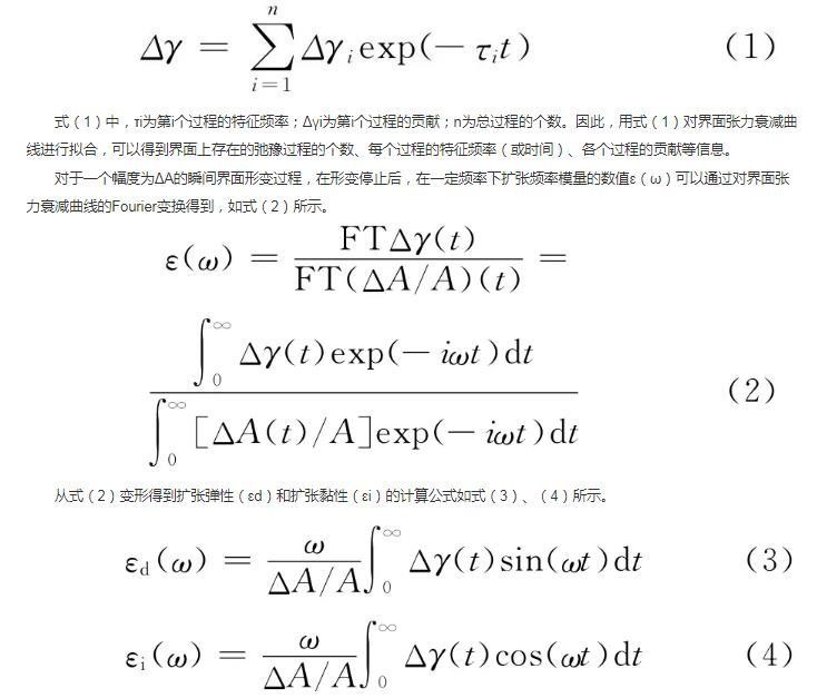 本研究中采用界面张力弛豫法,通过对受扰动界面张力衰减曲线拟合获得界面张力改变量随时间变化的函数关系,再经过Fourier变换,计算得到界面扩张参数的全频率谱,从而获得界面上活性分子行为的信息。