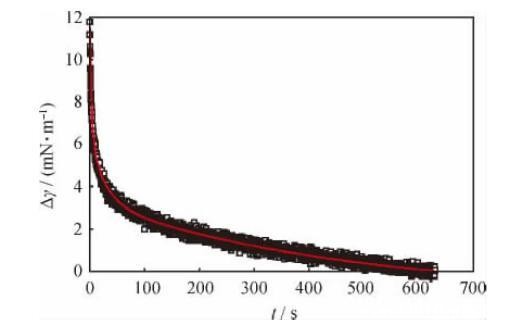 当活性分子界面吸附膜达到平衡时,对其实施一个突然的扰动,则界面上各活性分子均会对此扰动产生响应。界面和体相间分子交换的快慢、分子在界面上排列的变化、分子间相互作用的强弱等信息均会反映在扰动停止后的界面张力衰减曲线上。典型的界面张力(Δγ)衰减曲线及其拟合曲线如图1所示。