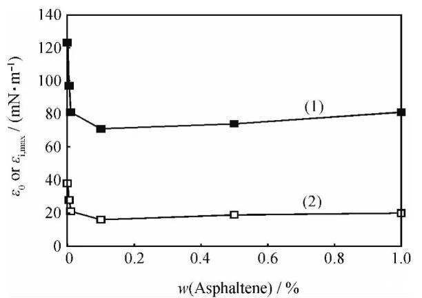 图8含不同量沥青质的煤油-1750mg/L HMPAM水溶液体系的极限扩张弹性(ε0)和扩张黏性最大峰值(εi,max)