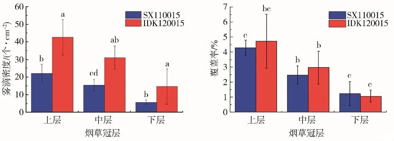 同一处理,烟草上、中、下冠层的药液雾滴密度和覆盖率具有显著差异,采用同一种喷头,不同处理间药液雾滴密度和覆盖率差异也达到显著水平,见图2。