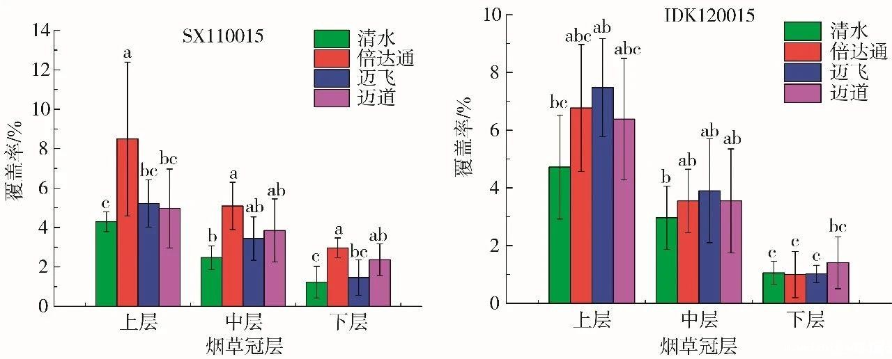 如图3所示,采用SX110015喷雾时,添加助剂能够显著提高药液雾滴在烟草上、中和下冠层的覆盖率。其中,倍达通助剂的效果最为显著,分别提高97.9%、106.1%和141.5%,而迈道对烟草下层的药液雾滴覆盖率提高92.7%。