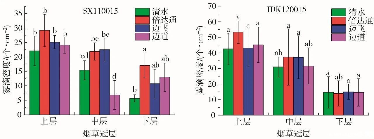 采用SX110015喷雾时,添加助剂能够显著提高烟草上层和下层的药液雾滴密度。添加倍达通、迈飞和迈道烟草上层药液雾滴密度分别提高32.0%、13.7%和9.0%,下层分别提高202.8%、91.3%和130.6%。添加倍达通和迈飞处理的烟草中层药液雾滴密度分别提高42.1%和46.4%,而添加迈道的处理则降低56.6%。