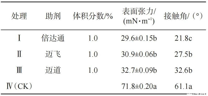 表3添加喷雾助剂对药液表面张力和雾滴接触角的影响