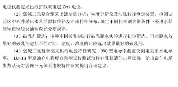 本文主要利用了OMEC PIP9.0型颗粒图像分析仪检测弱碱三元驱乳状液乳化程度;动态界面18luck国际检测弱碱三元采出液油水界面动态界面张力;DHR-2界面流变仪测定弱碱三元复合驱采出液界面强度;ZetaPALS电位仪检测弱碱三元驱采出液扩散双电层电位;BT-9300H型激光粒度分布仪测定弱碱三元复合驱采出污水中悬浮固体粒径以及油珠粒径分布;多种不同破乳剂进行破乳脱水实验进行初步筛选,再对脱水效果好的破乳剂进行不同时间、温度、浓度的比较选出效果最好的破乳剂;990型电导率测定仪测定采出水电导率;IJJ-IIB型原油介电强度自动测试仪测试取样井在不同时期,不同化学剂含量下的击穿场强。