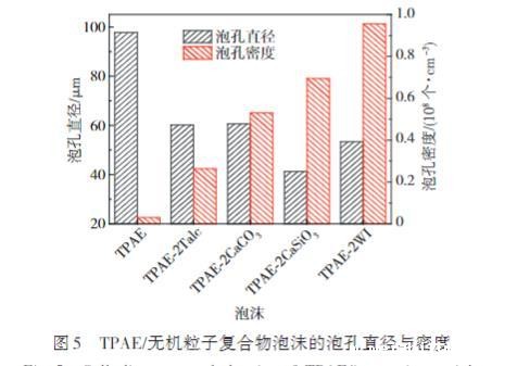 其中,相比较于Talc,CaCO3、CaSiO3、WI这3种无机粒子对于TPAE泡沫泡孔结构的改善效果更为显著,具有更高的泡孔密度。这是因为根据异相成核理论公式(7)