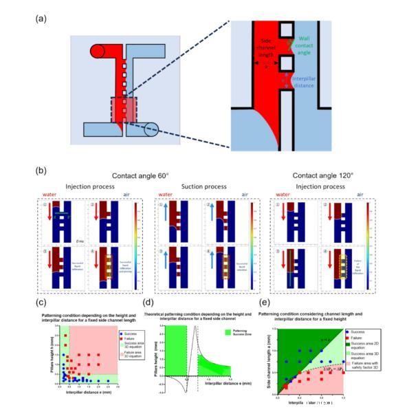 图2展示了用于模拟液体填充和图案化条件的数值模拟和实验验证,进一步分析了在微流体平台中实现毛细钉扎过程的成功条件。图2a展示了与图案化成功条件相关的物理参数,包括柱子的高度、间距和侧通道的长度。通过这些参数的控制,可以预测液体在微柱之间的保留情况。图2b展示了液体填充过程的数值模拟,包括在不同接触角(例如60°和120°)条件下的液体流动和钉扎效果。模拟结果显示了如何通过改变接触角和压力控制液体在微柱之间的流动和停留。图2b的模拟验证了在较大接触角下液体被钉扎在微柱边缘的效果。图2c至2e总结了不同微柱高度、间距和侧通道长度对液体保留过程的影响,通过这些参数优化可实现液体在微柱之间的稳定钉扎,适用于后续的细胞培养实验。
