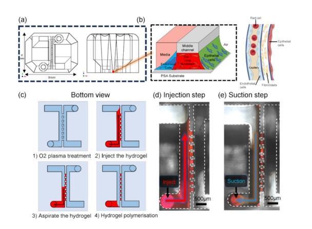图1展示了一个基于表面张力的开放式微流体平台的结构和液体图案化过程,用于再现肺部的三维细胞微环境。图1a展示了微流体平台的顶视图和侧视图。平台的中心区域包含微柱阵列,用于形成薄的水凝胶膜,两侧是包含不同细胞悬浮液的流体通道。图1b展示了水凝胶和不同细胞层的位置安排,模拟肺部细胞环境的气-液界面结构。图1c到图1e展示了图案化过程的两个关键步骤——液体注入和保持。首先,水凝胶液体通过微柱流动;当液体达到通道的扩展区域时,使用吸取器将多余液体移除,剩余部分被保持在微柱之间形成所需的薄层。这一过程中利用了表面张力的“毛细钉扎”现象,即通过几何结构和表面特性来控制液体的流动和停留。