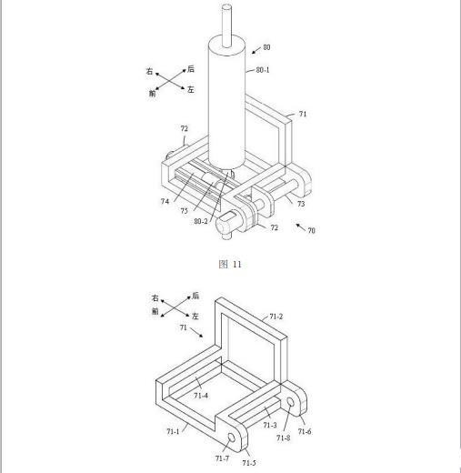 如图13所示,滑动座72包括第一U形板72-1、第二U形板72-2、盖形板72-3、第一尾板72-4、以及第二尾板72-5。第一U形板72-1和第二U形板72-2的开口端都与盖形板72-3的左侧面(即里侧面)固定连接,并且第一U形板72-1和第二U形板72-2均与盖形板72-3相垂直,其中盖形板72-3沿竖直方向延伸且盖形板72-3上设置有通孔72-8,第一U形板72-1和第二U形板72-2均沿水平方向延伸;第一U形板72-1位于第二U形板72-2的上方,第一U形板72-1与第二U形板72-2相互平行且二者之间设置有一个缝隙72-9。在本实施例中,第一U形板72-1与第二U形板72-2相同。