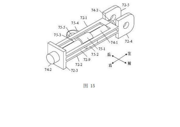 如图15所示,滑动座72沿左右方向设置,第三丝杆74设置于滑动座72的内部空腔内;第三丝杆74的第二主杆体部74-1位于第一U形板72-1、第二U形板72-2和盖形板72-3围成的框体结构内;第二主杆体部74-1的右端(即与第三手调旋钮74-2连接的一端)穿入盖形板72-3的通孔72-8内,并且第三手调旋钮74-2位于盖形板72-3的右侧(即盖形板72-3的背向第一U形板72-1和第二U形板72-2的一侧面);第二凸缘部74-3设置于第一U形板72-1和第二U形板72-2的封闭端的左侧(即外侧),并且第二凸缘部74-3位于第一尾板72-4与第二尾板72-5之间,第三手调旋钮74-2和第二凸缘部74-3均对第三丝杆74起限位作用。第二螺母件75套设于第三丝杆74上,第二螺母件75的螺母本体部75-1的内螺纹与第三丝杆74的第二主杆体部74-1的外螺纹相啮合;第一翼板75-2和第二翼板75-3均设置于第一U形板72-1与第二U形板72-2之间的缝隙72-9内,第一翼板75-2在缝隙72-9内向前延伸,第二翼板75-3在缝隙72-9内向后延伸,并且第二翼板75-3外边缘的凸环75-4伸出到第一U形板72-1和第二U形板72-2的后侧。