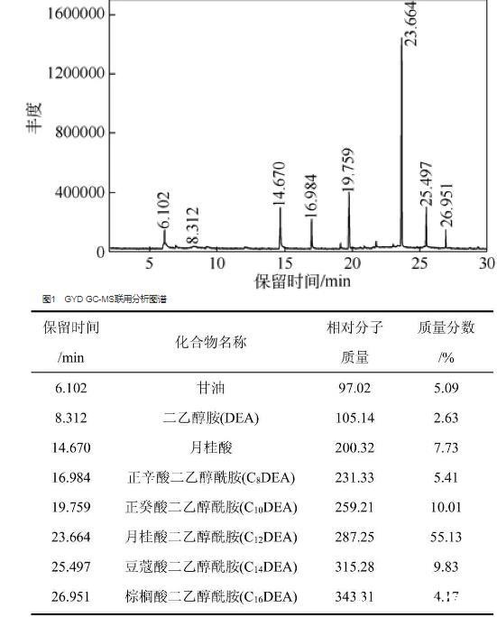 取一定量的GYD,用甲醇作溶剂,将其稀释至约0.4%的质量分数后,进行GC-MS全扫描分析,得总离子流色谱图见图1。用气相色谱数据处理系统,以峰面积归一法测得其中各组分的相对质量分数,分析结果见表2。从表2可以看出,GYD是一种组成复杂的烷基醇酰胺混合物,主要包括不同碳数脂肪酸二乙醇酰胺和剩余原料甘油、二乙醇胺、月桂酸等。其中,月桂酸二乙醇酰胺相对含量最高为55.13%。