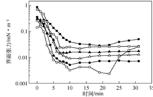 从图8可以看出,随C14DEA浓度增加,体系油水界面张力大幅降低,达到最低界面张力时间缩短,当质量分数大于0.1%时,油水界面张力能达10−3mN/m数量级,与CnDEA复配规律一致。