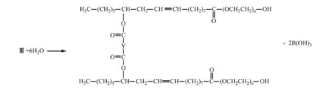 将0.12 mol聚乙二醇和0.04 mol硼酸依次装入带有搅拌器、分水器、回流冷凝器的三口烧瓶中,并连接减压装置。加热至120℃,在负压下进行反应至出水量不变,酯化过程如下所示: