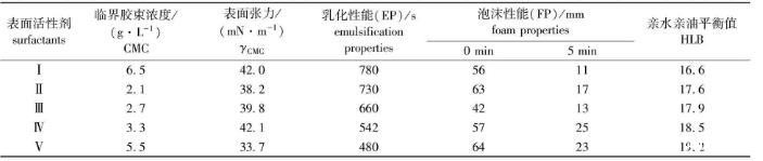 2.2.2 EP、FP和HLB值5种表面活性剂的乳化性能、泡沫性能及亲水亲油平衡值如表2所示。