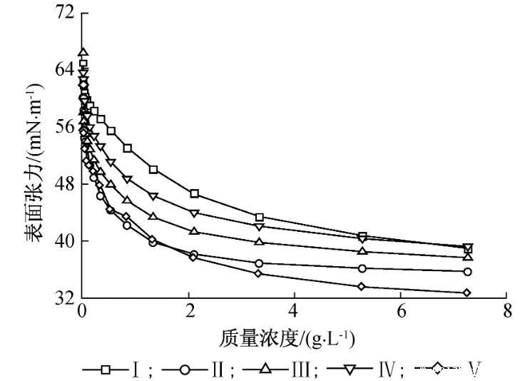 3.2 5种聚萜烯马来酸酐聚乙二醇酯高分子表面活性剂(Ⅰ、Ⅱ、Ⅲ、Ⅳ、Ⅴ)的CMC值分别为6.5、2.1、2.7、3.3和5.5 g/L,γCMC分别为42.0、38.2、39.8、42.1和33.7 mN/m。随着聚乙二醇相对分子质量的增大CMC和γCMC均呈现先减小后增大的趋势,化合物Ⅱ表面活性最佳;随着聚乙二醇相对分子质量的增加,聚合度(DP)先增大后减小,化合物Ⅱ聚合度最大,为4.9。