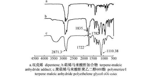 3.1以工业双戊烯为原料,先合成萜烯马来酐加合物,再分别与不同相对分子质量的聚乙二醇(400,600,1 000,2 000,4 000)反应,合成了5种聚萜烯马来酸酐聚乙二醇酯高分子表面活性剂(Ⅰ~Ⅴ),并用红外光谱仪和凝胶色谱仪对结构进行了确证。